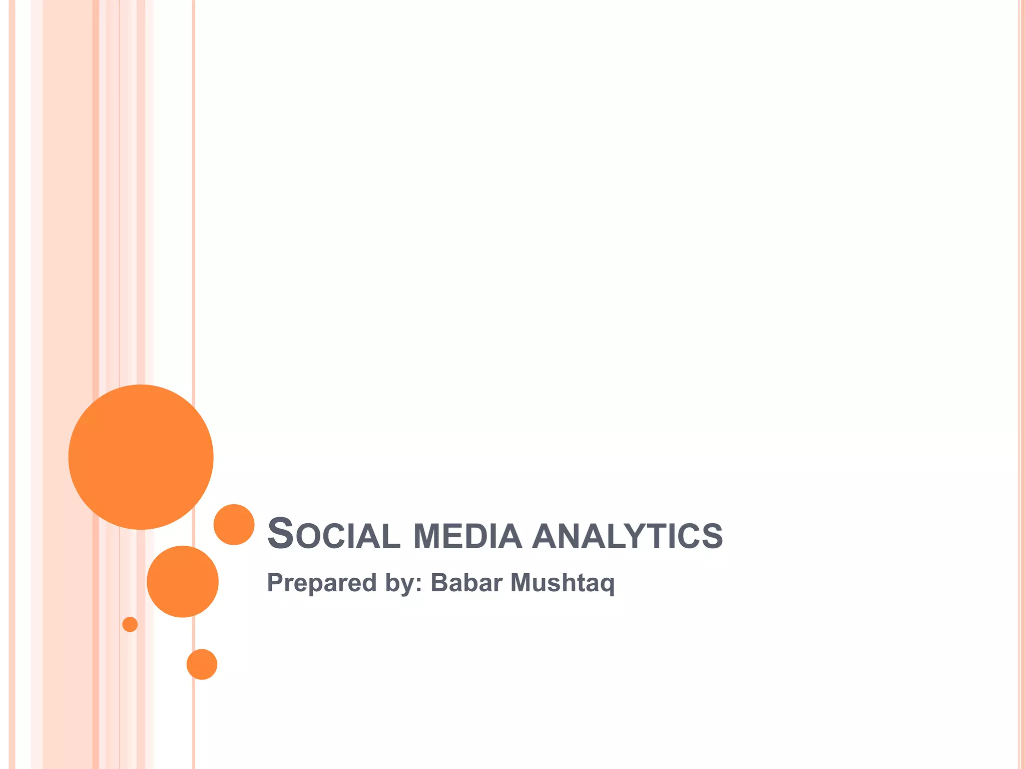 Social media analytics is the process of collecting and analyzing data from social networks to improve business decisions. It allows marketers to spot trends, quantify returns on investment of campaigns, and analyze performance of social media platforms and posts. Key metrics that should be tracked include interactions, followers, click-through rates, audience demographics, competitor performance, ad spending metrics, influencer engagement, and customer sentiment. Tracking these metrics enables optimization of social media strategies and content.