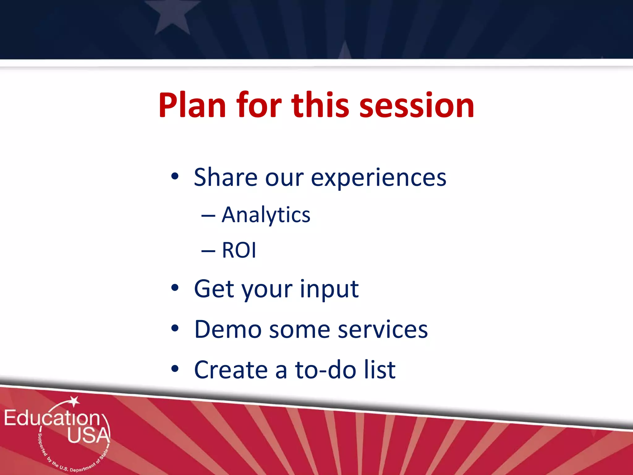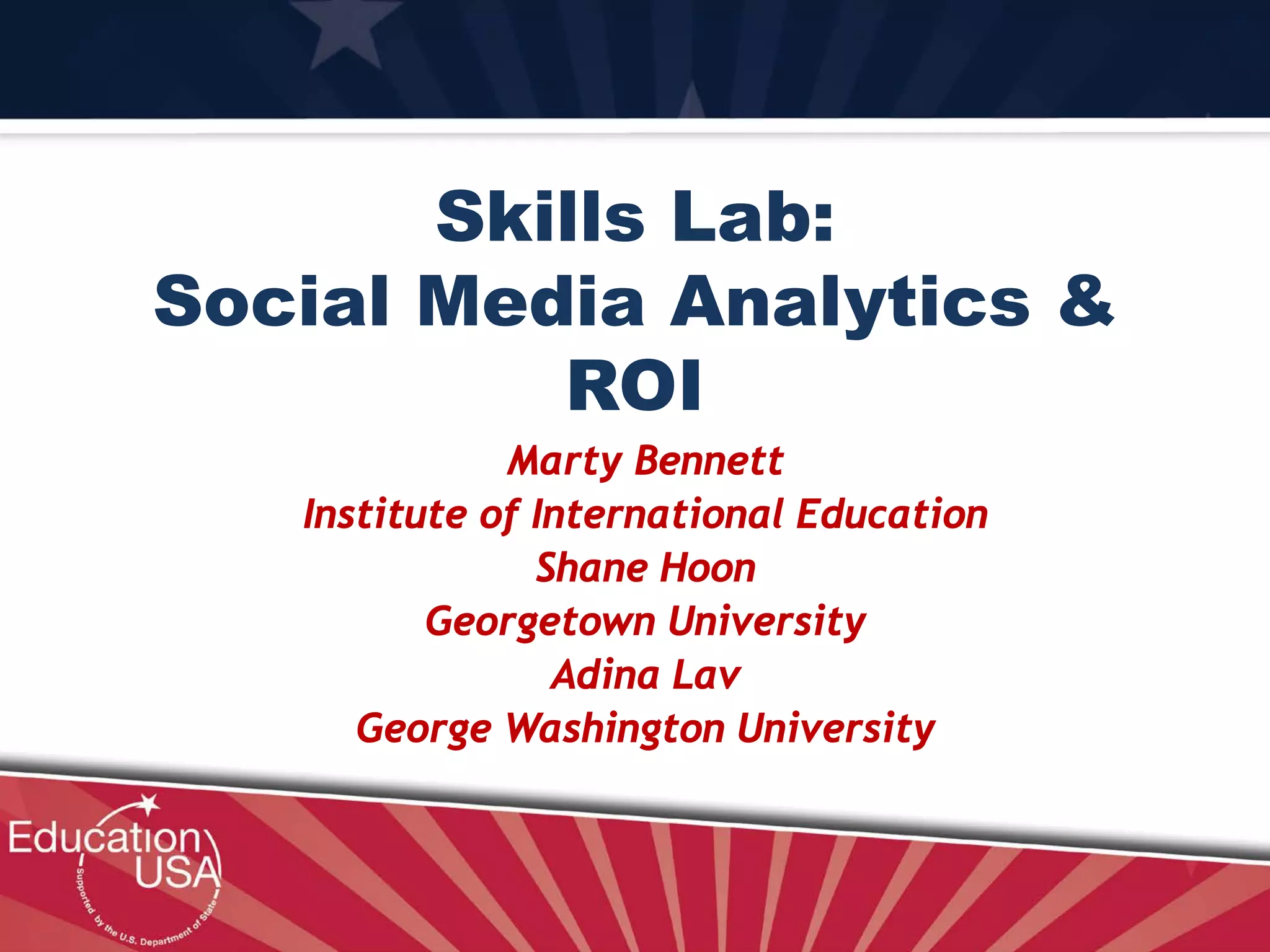 This document summarizes a session on social media analytics and ROI for education institutions. It discusses experiences with analytics and ROI, infrastructure like websites and CRM systems, social media platform and resource considerations, and ways to measure engagement and ROI. Contact information is provided for the presenters to discuss specific questions.