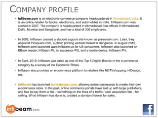 2) The project involves three steps - 1) increasing awareness of Infibeam's Facebook presence, 2) launching an Infibeam store on Facebook, and 3) creating a feedback system for Infibeam across multiple platforms.