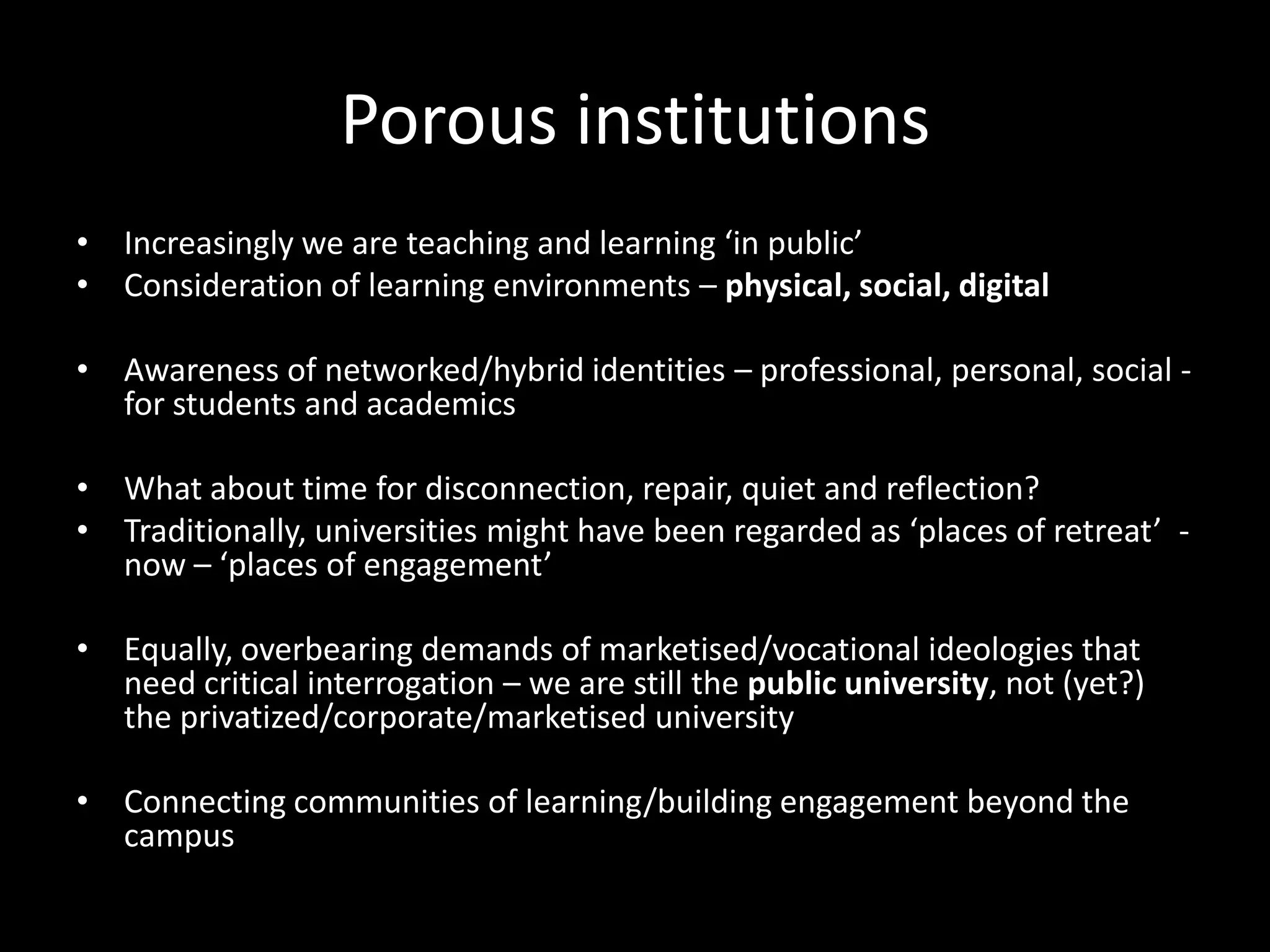 The document discusses the evolution of teaching and learning environments due to social media and technology, highlighting the shift from traditional university roles as 'places of retreat' to 'places of engagement.' It examines the implications of hybrid identities, the need for critical interrogation of marketized ideologies, and the importance of different learning spaces and pedagogies like ambulatory or place-based approaches. The document also emphasizes the need for reflective practices, the changing roles of educators, and the balance between public engagement and the necessity for quiet, offline spaces.