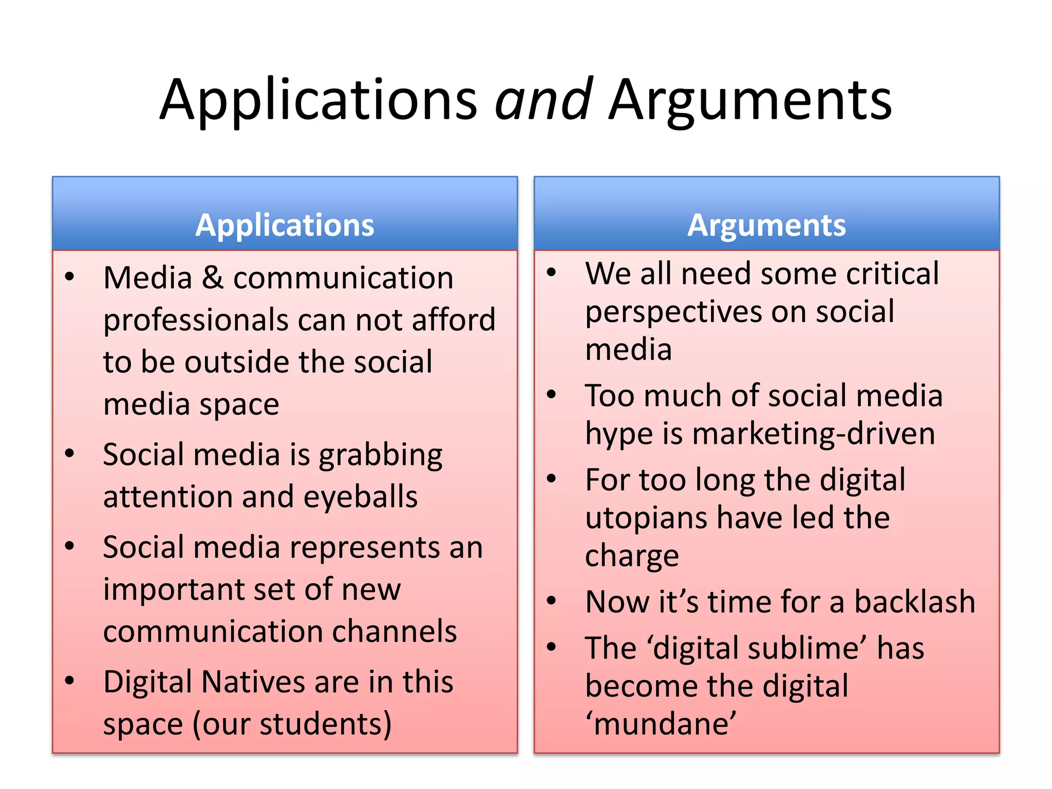 This document discusses applications and arguments regarding social media and professional communicators. Key points include: