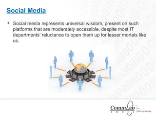Social media can serve as a new learning tool but requires careful marketing to ensure adoption among various user groups. Users typically go through five stages of adoption: awareness, interest, evaluation, trial, and adoption, with innovators and early adopters leading the way. By targeting these groups with free workshops and success stories, organizations can facilitate wider acceptance of social media as an effective learning medium.