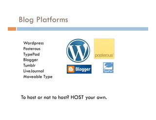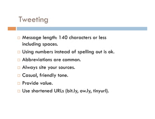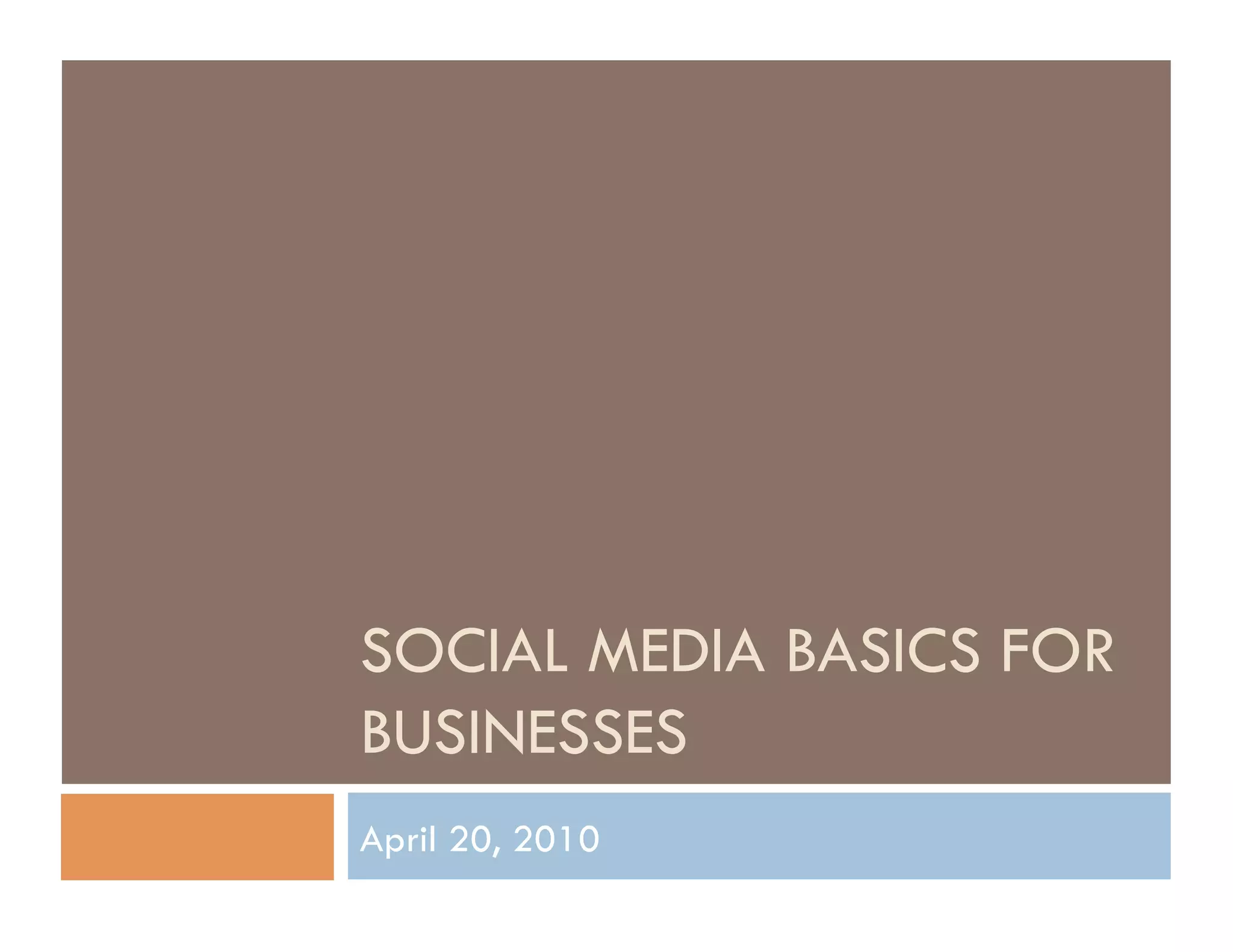 This document provides an overview of social media basics for businesses. It defines social media, discusses various social media platforms like blogs, Facebook, Twitter, YouTube and LinkedIn. It provides best practices and guidelines for using each platform, including creating profiles, posting engaging content and strategies for success. Real-world case studies of how businesses have effectively used social media are also presented.