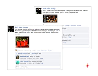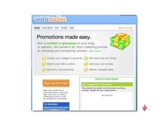 The document outlines a strategic planning framework for enhancing audience engagement through social media, emphasizing the importance of creating a clear program structure and defining success metrics. It provides guidelines for conducting promotions on Facebook, including participation rules and suggested measurement metrics for evaluating effectiveness. Additionally, it lists resources and tools for further learning and monitoring social media activities.