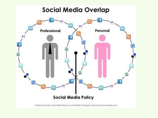 This document provides guidance on using social media for non-profit organizations. It discusses choosing target audiences on different social media platforms like Facebook, LinkedIn, and Twitter. It emphasizes defining goals and strategies for each channel and focusing content around problems and solutions. The document also cautions on legal issues like copyright and the importance of social media policies. Overall, it encourages non-profits to thoughtfully engage audiences on appropriate channels to further their missions.