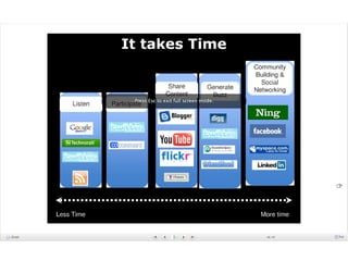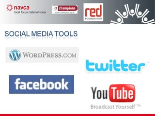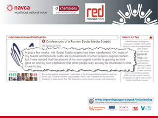 The document discusses the importance and relevance of social media for communication in the voluntary sector, emphasizing its role in storytelling, networking, and engaging communities. It outlines the shift from static websites to interactive platforms (Web 2.0), highlights statistics on social media usage, and provides guidance for organizations on integrating social media into their strategies. Additionally, it addresses challenges faced by organizations in adopting social media, including knowledge gaps and access issues, and encourages a balanced approach that complements face-to-face communication.