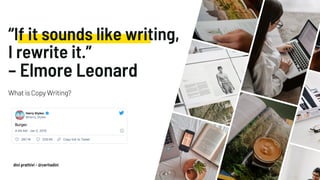 The document discusses copywriting for social media. It defines copywriting as writing text for advertisements or publicity materials with the goal of persuading readers. Copywriting is compared to content writing, with the key difference being that copywriting aims to sell people on an idea or brand while content writing informs readers. Effective copywriting for social media should use visual design elements, avoid wordiness, pique reader interest with valuable information, and bring the context to readers quickly in order to grab their attention in a single moment.