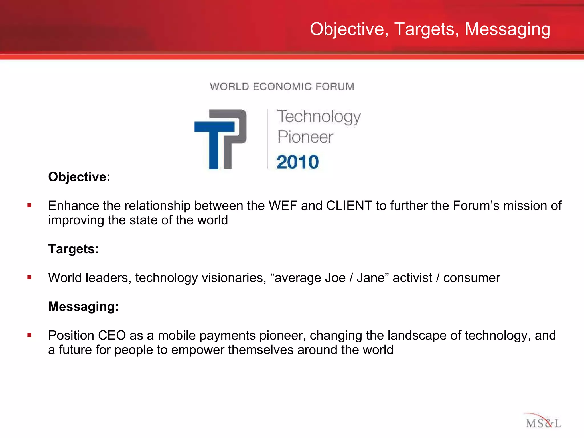 The document outlines a strategy to enhance the relationship between the World Economic Forum (WEF) and a client company through social media engagement during the WEF's annual Davos event. The strategy involves the client's CEO blogging before and after the event, answering questions from followers on video at Davos, and posting on social media channels like Twitter, Facebook and YouTube to share the CEO's experiences and perspectives from Davos. The goals are to drive conversation around Davos, position the CEO and client as thought leaders, and boost the client's online presence and follower counts.