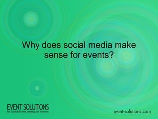 The document discusses how social media, specifically Facebook and Twitter, can be used to strengthen events. It provides examples of how an event planning company called Event Solutions used Facebook and Twitter to promote their 2009 conference. They were able to increase engagement among attendees, obtain real-time feedback, and have Twitter become a top referring site to their website during the event.