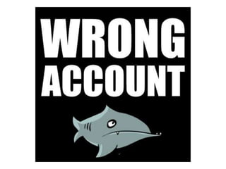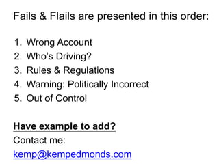 The document outlines various social media missteps categorized by themes such as wrong account usage, managing social media messaging, and understanding rules and regulations. It emphasizes the importance of honesty, awareness of trending topics, and appropriate responses to crises, while cautioning against insensitivity during disasters. It invites readers to contribute examples of social media failures for further updates.