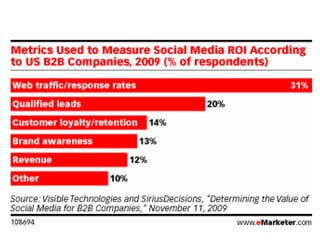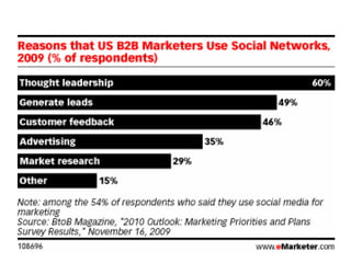 B2B social media usage tends to focus on generating awareness, leads, and building relationships rather than direct sales due to longer sales cycles and decision making processes involving multiple people. Grasshopper.com sent chocolate covered grasshoppers with a promotional video link to thousands of influencers to increase awareness. Cree Lighting maintained social media profiles and participated in discussions to generate leads. Research shows B2B companies are more active than B2C companies on social networks, blogs, monitoring brand mentions, and engaging in discussions. Listening to conversations, creating helpful content, and establishing authority as an industry expert are effective social media strategies for B2B.