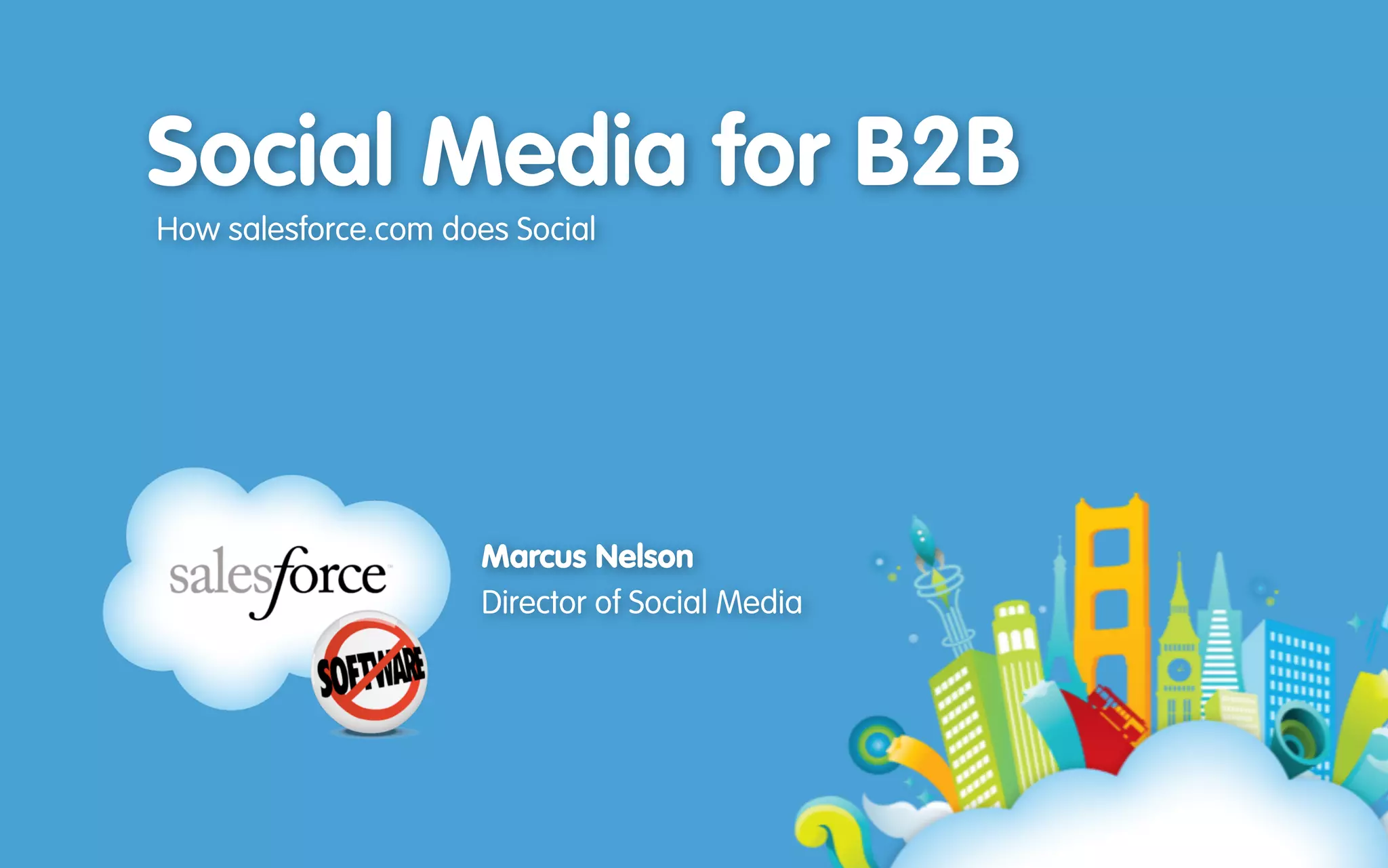 The document outlines Salesforce's approach to leveraging social media for B2B marketing, emphasizing employee engagement and content creation across various platforms. It discusses the importance of a clear social media policy, crisis management, and metrics for measuring success. The presentation also highlights the need for continuous content creation and optimization tailored to audience engagement, particularly on Facebook.