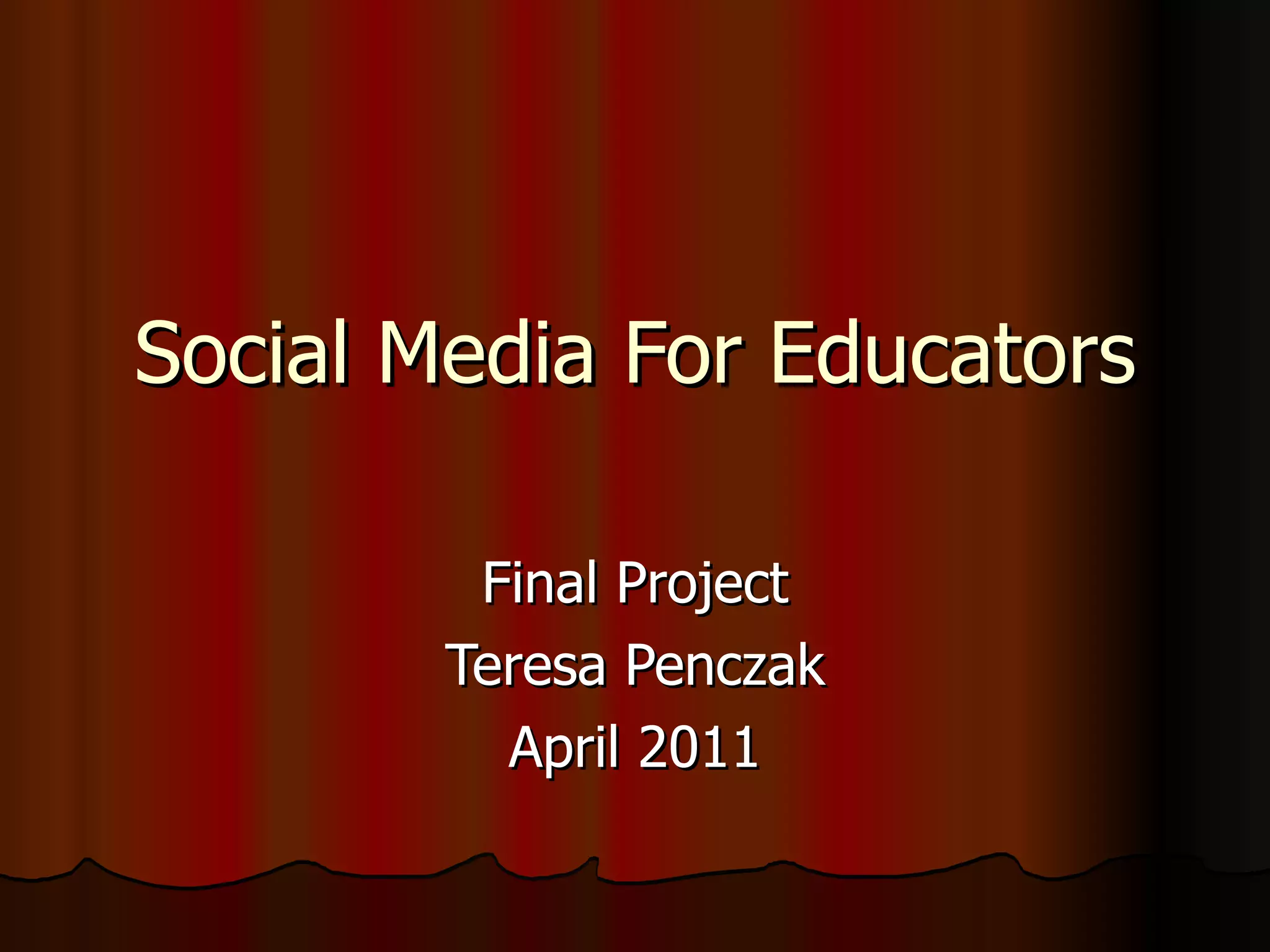 This document discusses using social media for educational purposes. It outlines various social media platforms like Facebook, Twitter, YouTube, and LinkedIn that educators can use to strengthen their professional learning networks. It also discusses using Moodle for online learning and social bookmarking tools like Diigo for organizing and sharing web resources. The document reflects on successes using these tools, as well as ongoing challenges like managing multiple accounts and choosing the best platforms.
