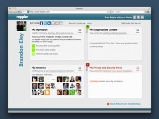 Social media is widely used by employers to screen candidates. Over 91% of employers now use social media for this purpose. It is important for students to manage their online reputation through social media as inappropriate or unprofessional posts can disqualify them from jobs. The document provides tips on using social media to build a positive online profile, including being yourself, self-censoring posts, managing privacy settings, and engaging with potential employers online through following them and participating in relevant discussions.