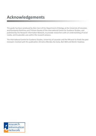 This document provides a guide for researchers on using social media. It begins with an introduction that defines social media as internet services where online content is generated by users. It then discusses what social tools are available, including blogs, microblogs, social networking, social bookmarking, and more. The guide interviews ten researchers about their use of social media for various aspects of research like identifying, creating, assuring quality and disseminating knowledge. It aims to provide both benefits and limitations of social media to help researchers decide how to integrate these tools into their work.