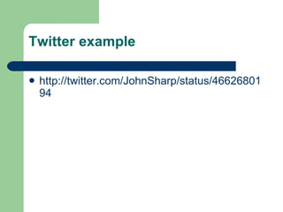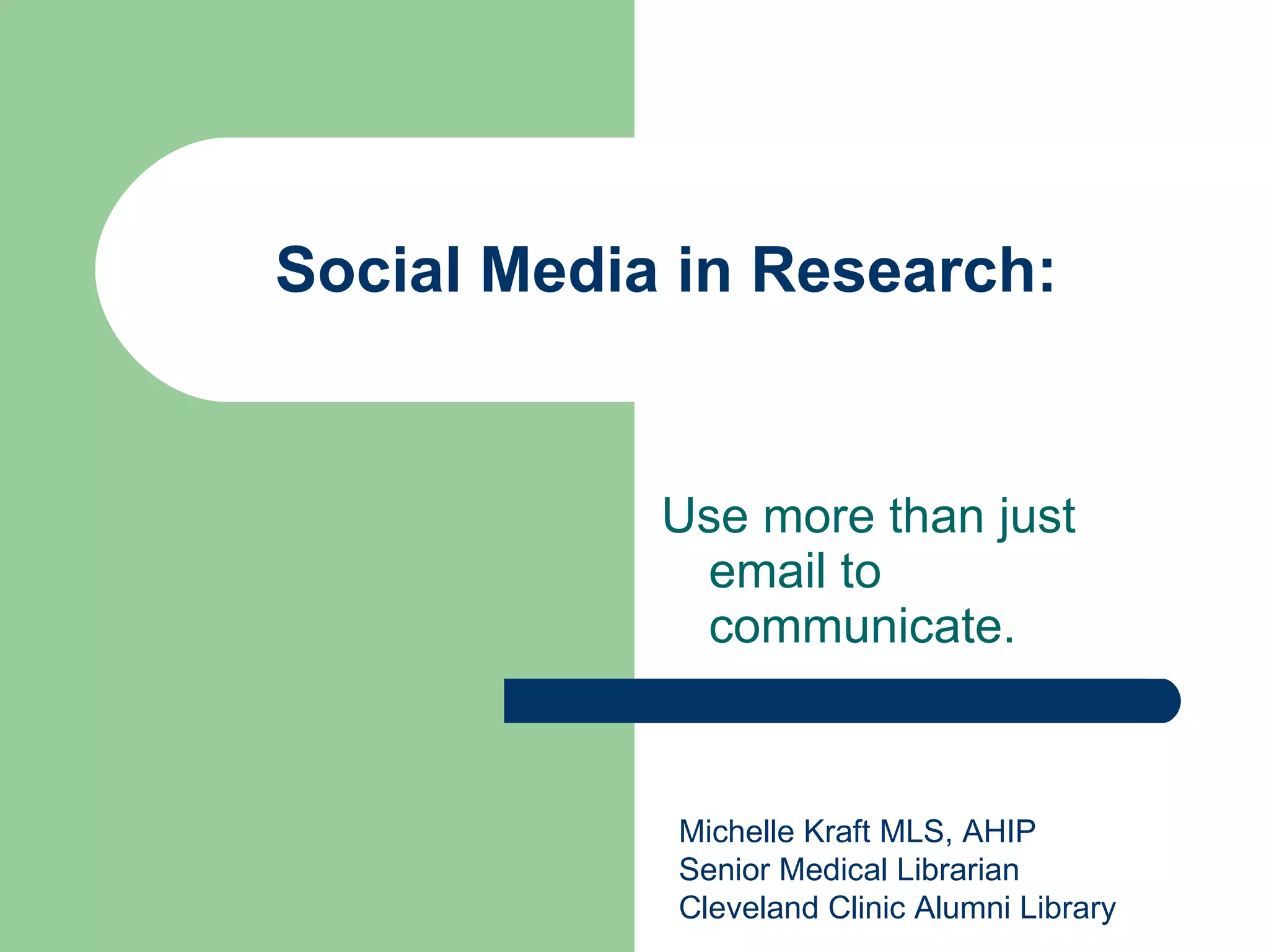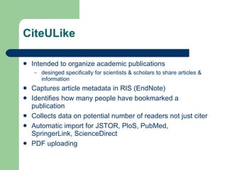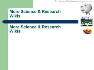 The document discusses the role of social media in research communication, highlighting various platforms like Google Docs, Twitter, and blogs for collaboration and information sharing. It provides examples of science and research blogs and wikis, emphasizing the importance of tagging and social bookmarking for organizing academic work. Additionally, it addresses common misconceptions about social media use within the scientific community and encourages researchers to adopt these tools to enhance their research dissemination and networking.