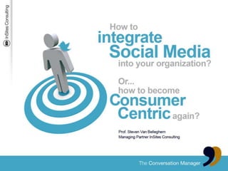 The document outlines a pragmatic roadmap for integrating social media into organizations, consisting of 13 strategic projects across four stages: capability building, pilot mode, integration mode, and leverage mode. Each stage focuses on specific goals such as building internal belief, executing pilot projects, redesigning company structure, and leveraging social media investments to increase customer centricity. The aim is to enhance organizational flexibility and improve ROI on marketing efforts while fostering a positive customer interaction culture.