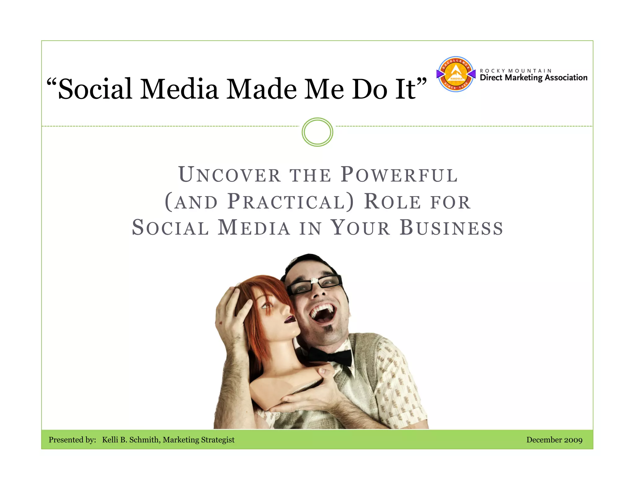 The document discusses the transformative role of social media in business, emphasizing the need for companies to adapt to current social media trends to engage with customers effectively. It outlines challenges such as the gap between expectations and reality, and provides strategies for companies to assess their readiness and develop effective social media practices. Key recommendations include understanding customer demographics, defining clear objectives, and gradually integrating social media into business strategies.