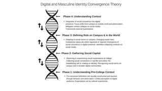 This document summarizes a study on how social media influences the gender identity and performance of male college students. It examines how first-year and senior male students describe their social media behavior and how it intersects with their gender identity. Key findings include that masculinity is just one part of a student's identity, pre-college concepts influence college views, and navigating multiple identities is difficult. The study develops a four-stage theory of how students' understanding and use of social media evolves from gathering social capital as freshmen to understanding broader contexts as seniors. It recommends extending digital citizenship education and better integrating physical and digital communities.