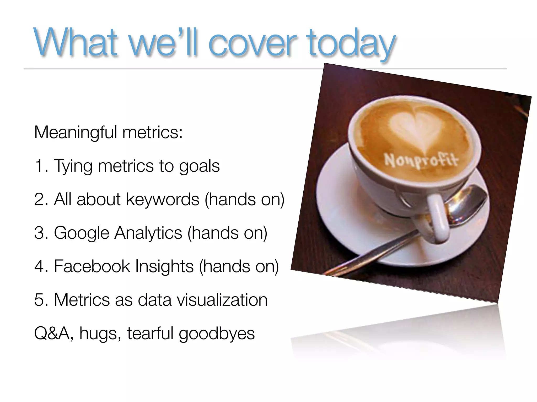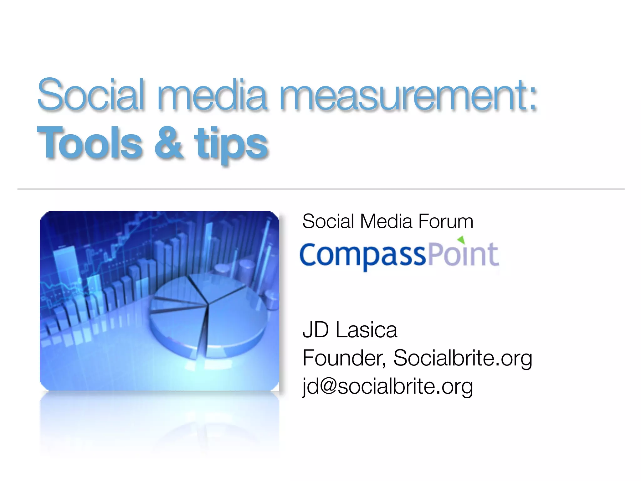 The document discusses social media measurement and metrics. It covers tying metrics to organizational goals, using keyword analysis tools like SEMRush and Google's Keyword Planner to understand traffic drivers, and diving into analytics from Google Analytics and Facebook Insights. The presentation also discusses visualizing metrics and showcases examples like a museum's open data dashboard. Resources like Metricly and Socialbrite's sharing center are provided for additional metrics tools.