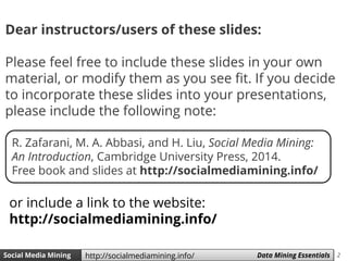 The document discusses data mining and social media mining. It introduces the concept of knowledge discovery in databases (KDD) as the process of extracting useful patterns from raw data. The KDD process involves collecting and preprocessing data, then applying data mining algorithms to extract patterns. Common data mining algorithms covered are decision trees, naive Bayes classification, and k-nearest neighbors. The document also discusses text representation using vector space models and TF-IDF weighting.