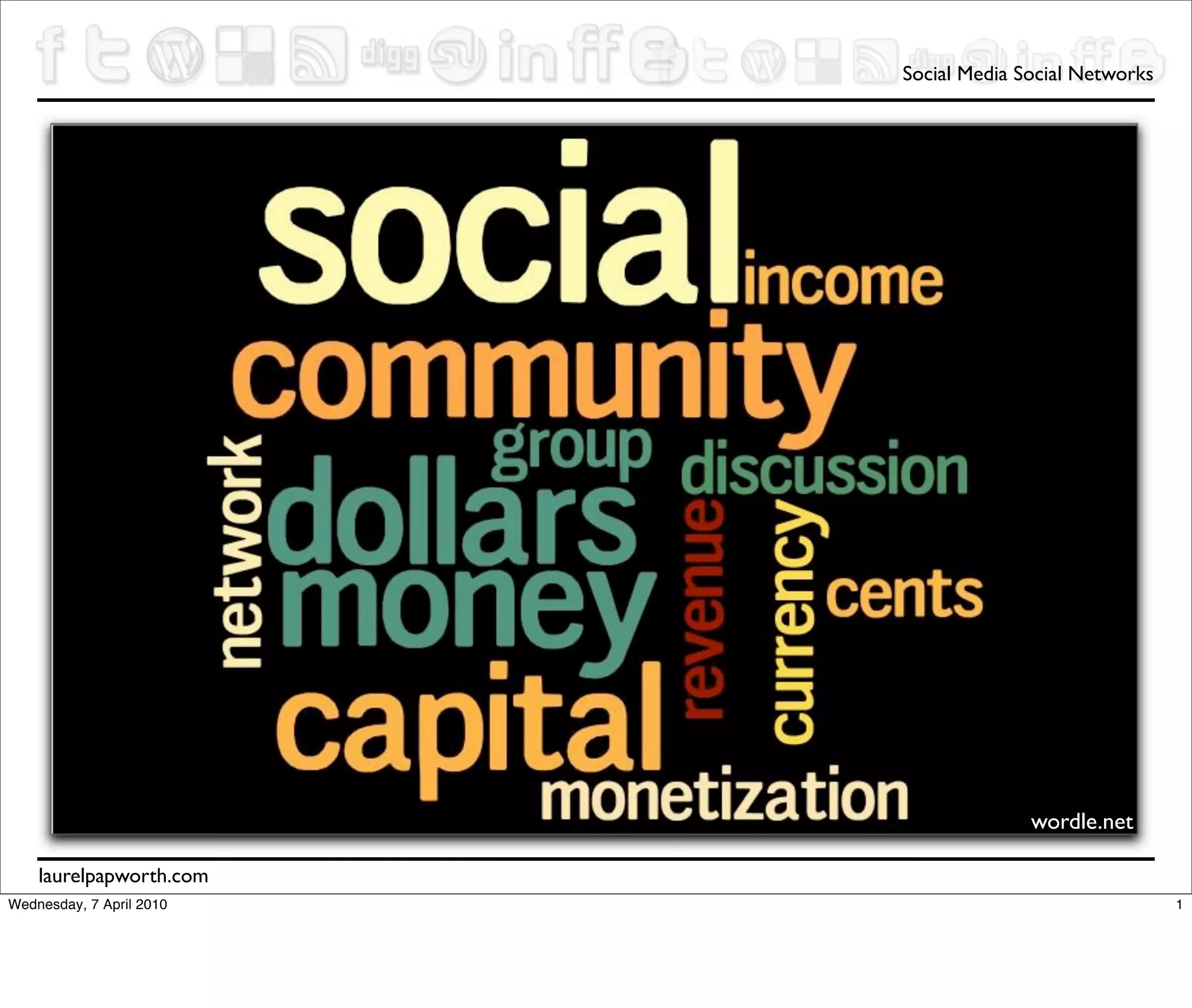 The document discusses various topics related to social media and social networks. It covers how currency has evolved from bartering and commodity money to modern fiat currency and virtual currencies. It also discusses concepts like reputation, trust, and return on investment (ROI) related to social networks. Finally, it explores ways to monetize social media through methods like freemium models, advertising, affiliate marketing, and peer-to-peer lending.
