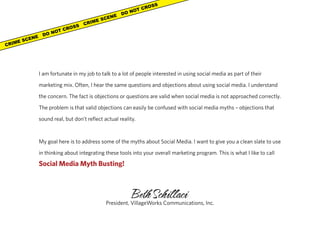 The document addresses ten common myths about social media, highlighting misconceptions such as time consumption, target audience demographics, and the importance of integrating social media with other marketing efforts. It emphasizes the necessity of setting clear goals, creating a strategy, and adapting to the evolving nature of social media platforms while stressing that social media is not merely a fad and requires dedicated management. Ultimately, the document encourages businesses to embrace social media as a valuable marketing tool and provides guidance on how to effectively implement it.