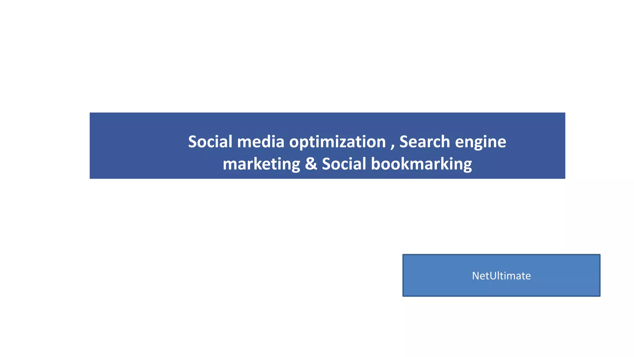 This document discusses social media optimization, search engine marketing, and social bookmarking. It provides information on how people use the web to find information, including through directories, search engines, and social media. It then discusses what social media optimization is and how to perform SMO through social networking, microblogging, video promotions, slide promotions, blogging, photo sharing, group participation, answering questions, commenting, RSS feeds, and widgets. Finally, it discusses some web marketing and analysis tools.