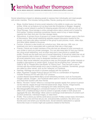 The document lists 20 popular social media platforms and provides a brief overview of each one, including their logo, target audience, overall purpose, and in some cases alternate uses. The platforms covered include About.me, Blogger, Box.net, Delicious, Digg, Facebook, Flickr, Foursquare, Google Plus, Klout, LinkedIn, Pinterest, Skype, Slideshare, Twitter, Tumblr, YouTube, WordPress, Vimeo, and Yelp.