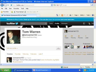 Social media allows users to connect, share information, and find jobs online. Sites like Twitter, Facebook, and LinkedIn allow users to network with connections and former colleagues, join groups in their industry, and view job postings with relevant hashtags or pages. To maximize their online presence when job searching, users should establish a positive personal brand through accomplishments, expertise, recommendations, and engaging profile content across multiple social media sites.