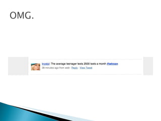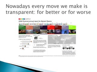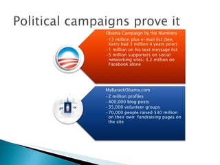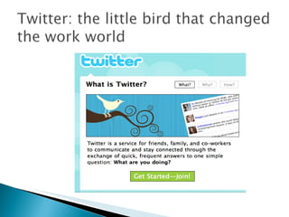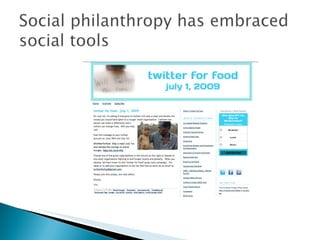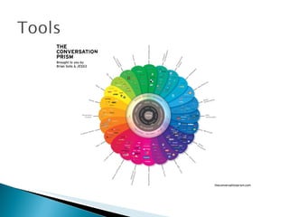 The document discusses the role and impact of social media on communication and society. It provides examples of how social media has enabled new forms of organizing and conversation. The document also outlines different types of social media tools and applications and how they have evolved the ways conversations take place.