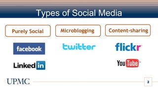 Social media tools include Facebook, LinkedIn, Twitter, Flickr, and YouTube. Facebook allows users to connect with friends and share updates. It has over 300 million active users, many outside the US. LinkedIn is a professional networking site with over 50 million users that allows users to create resume-like profiles. Twitter allows users to share short messages and see updates from followed accounts. Flickr is a photo sharing site hosted photos. YouTube is a video sharing site where users can view, comment on and share videos. These tools can help organizations engage audiences and monitor discussions.