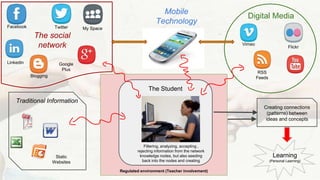 The document discusses the application of social media in higher education, highlighting the need for both educators and students to effectively integrate it into teaching and learning practices. It addresses challenges such as infrastructure constraints and the ambiguity between personal and educational uses of social media while emphasizing the redesign of learning environments to foster collaboration and innovative pedagogies. Recommendations include developing supportive policies, encouraging active learning, and adopting cloud-based tools for more meaningful engagement.