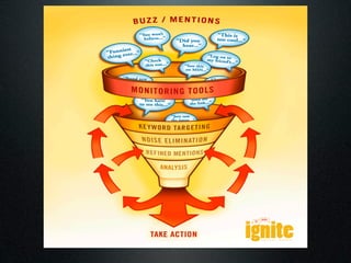 This document provides guidance on effectively engaging with social media. It emphasizes listening first before talking, and monitoring conversations to understand audiences and identify where they are engaging online. It also stresses the importance of integration across different communication channels and tools for listening, as well as focusing on outcomes over outputs when measuring the value of social media efforts.