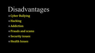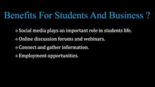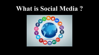 This document summarizes several popular social media platforms: Facebook has over 2.5 billion users worldwide and owns Instagram and WhatsApp; YouTube has 2.1 billion monthly active users and is used by students for studies; Instagram is a photo and video sharing app with over 2.35 billion active users that originated from "Instant photo and Telegram"; Twitter is a microblogging site with 396.5 million global users that shares images, videos, and thoughts; Telegram is an encrypted messaging app with over 100 million active users; WhatsApp is the world's most popular messaging app with over 2.7 billion monthly users that allows free text, voice, and video messaging between users.