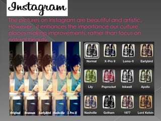 Social media creates unrealistic standards of beauty that negatively impact teenagers' self-esteem and body image. Constant exposure to filtered and photoshopped images on platforms like Instagram makes teenagers believe they must look similarly perfect. This fuels issues like eating disorders, depression, and bullying. Additionally, the need to curate an ideal online image and gain approval from peers exacerbates feelings of social isolation.