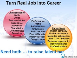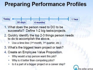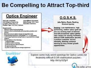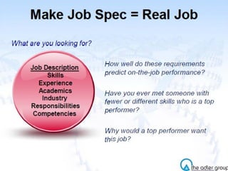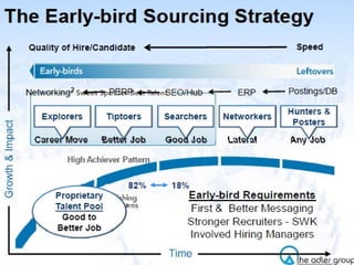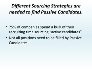 The document discusses strategies for attracting and recruiting top talent. It examines the importance of recruiting the top 20% of candidates who account for 40% of revenue. It identifies different types of candidates from active to passive and recommends focusing on semi-passive candidates. Referrals from existing employees are identified as the top source for hiring top performers. The document provides tips for sourcing passive candidates including referrals, networking, and tailored messaging focused on career growth rather than skills. It emphasizes the importance of job branding, compensation, and hiring manager quality in appealing to top talent.