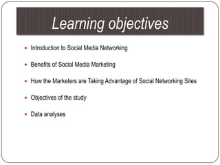 This document discusses the role and benefits of social media networking for businesses. It begins by introducing social media marketing and its objectives. It then outlines the key benefits of social media networking for businesses, including customer engagement, higher search engine rankings, increased traffic, brand building, and low-cost marketing. The document also discusses how marketers are using social media for activities like product launches, market research, branding, advertising, and customer loyalty. It provides objectives for a study on social media networking in Indian businesses. Finally, it presents data on the state of social media in India and how businesses are utilizing various social media tools.