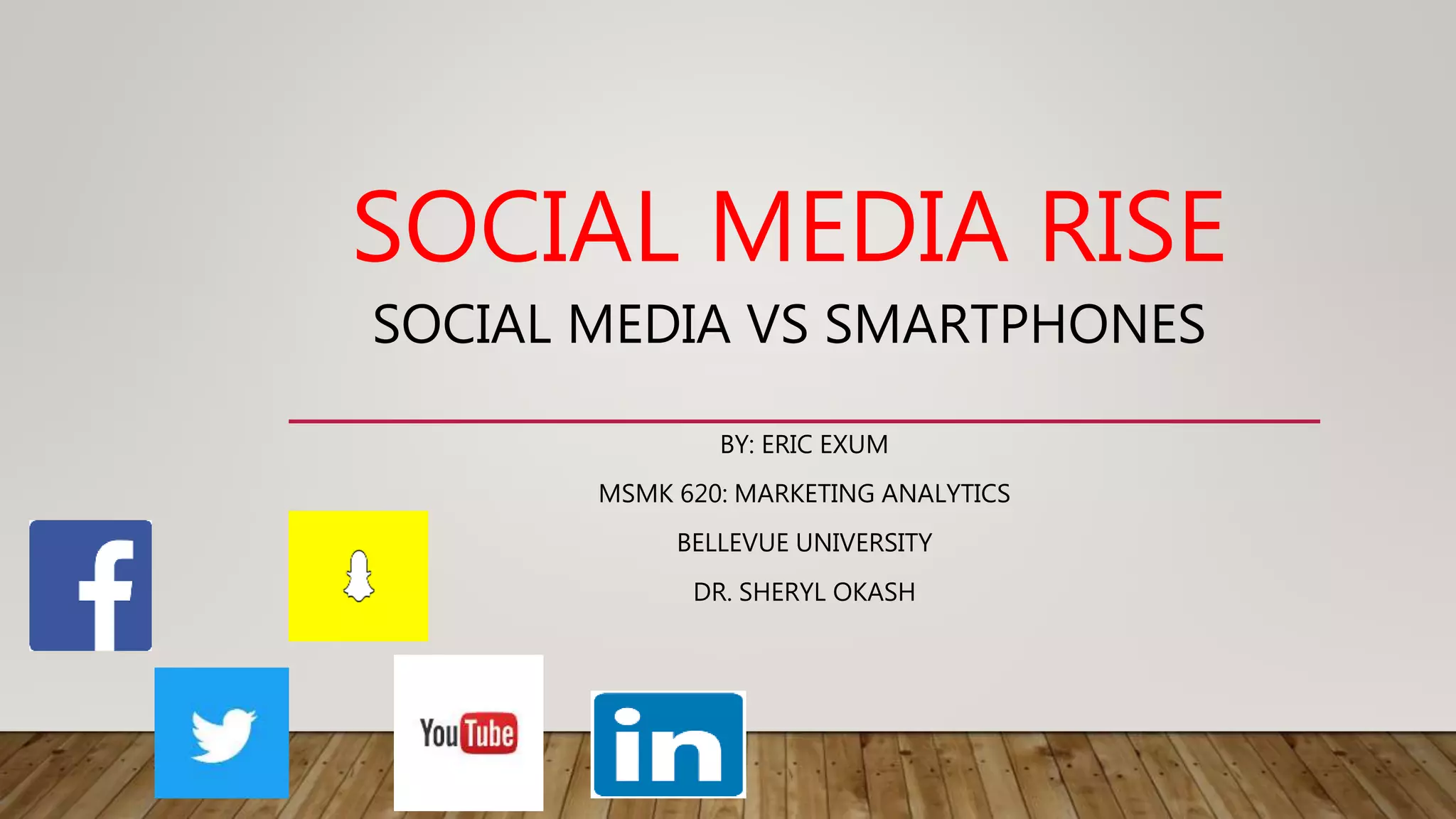 This document analyzes the rise of social media usage through smartphones. It hypothesizes that as the number of smartphones has increased, the number of social media accounts has also risen. The objectives are to determine daily internet and social media usage on smartphones, compare smartphone usefulness to laptops, identify how many users have social media on phones, and examine smartphone trends. Key findings include over 80% of users having social media on phones, smartphones surpassing laptops for internet searches, and 94% being likely to purchase another smartphone. The conclusion is that smartphones are replacing laptops and driving increased social media account growth.