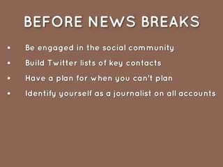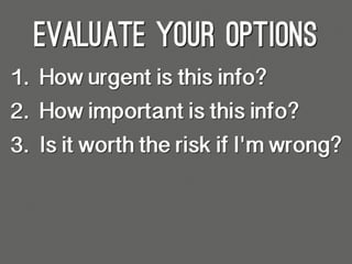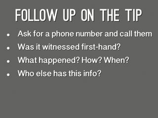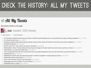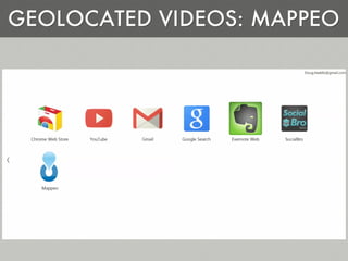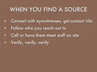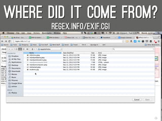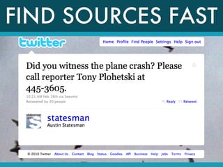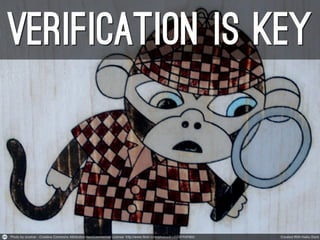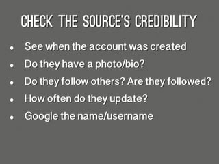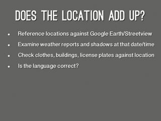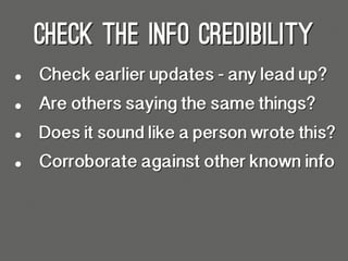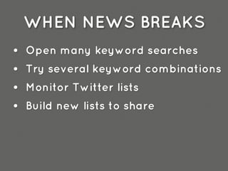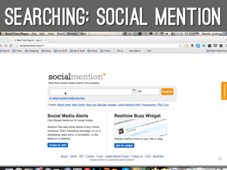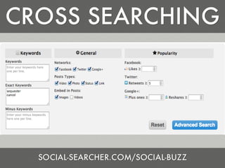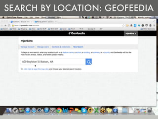 The document discusses methods for searching by keywords, location, and time, emphasizing the need for quick searches before reactions inundate the stream. It mentions specific tools like Identify in Firefox and Falcon for Chrome and includes credits for contributions made by Doug Haddix. Additionally, it references where to find related slides on SlideShare.