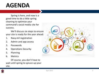 The document outlines six steps for optimizing U.S. Navy social media sites, including registration, managing access, updating passwords, ensuring operations security, planning, and monitoring metrics. It emphasizes the importance of only allowing authorized personnel access and maintaining strong passwords. Regular reviews and adjustments are recommended to align with evolving strategies and audience engagement.