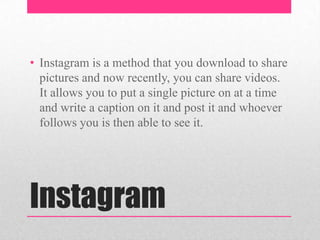 Instagram allows users to share single photos and videos with captions and have followers view them. Facebook is a mobile site where users can share photos, music, videos with friends and chat. Twitter allows sharing of photos and most videos with followers who can retweet or favorite the posts.