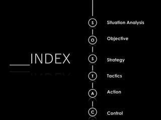 Social media strategy document outlines a situation analysis, objectives, strategy, tactics, actions, and control for a brand's social media presence. The situation analysis includes a brand analysis, competitor analysis, customer insights, and SWOT analysis. The objective is to build a strong online presence through new techniques and increased engagement. The strategy uses a PRACE model to build awareness, engage audiences, achieve conversions, and build customer relationships. Tactics include creating content, increasing engagement, and ads. Actions specify content types, tone, schedule, and online campaigns. Control measures include moderation, content output, campaign targets, and monthly reporting.