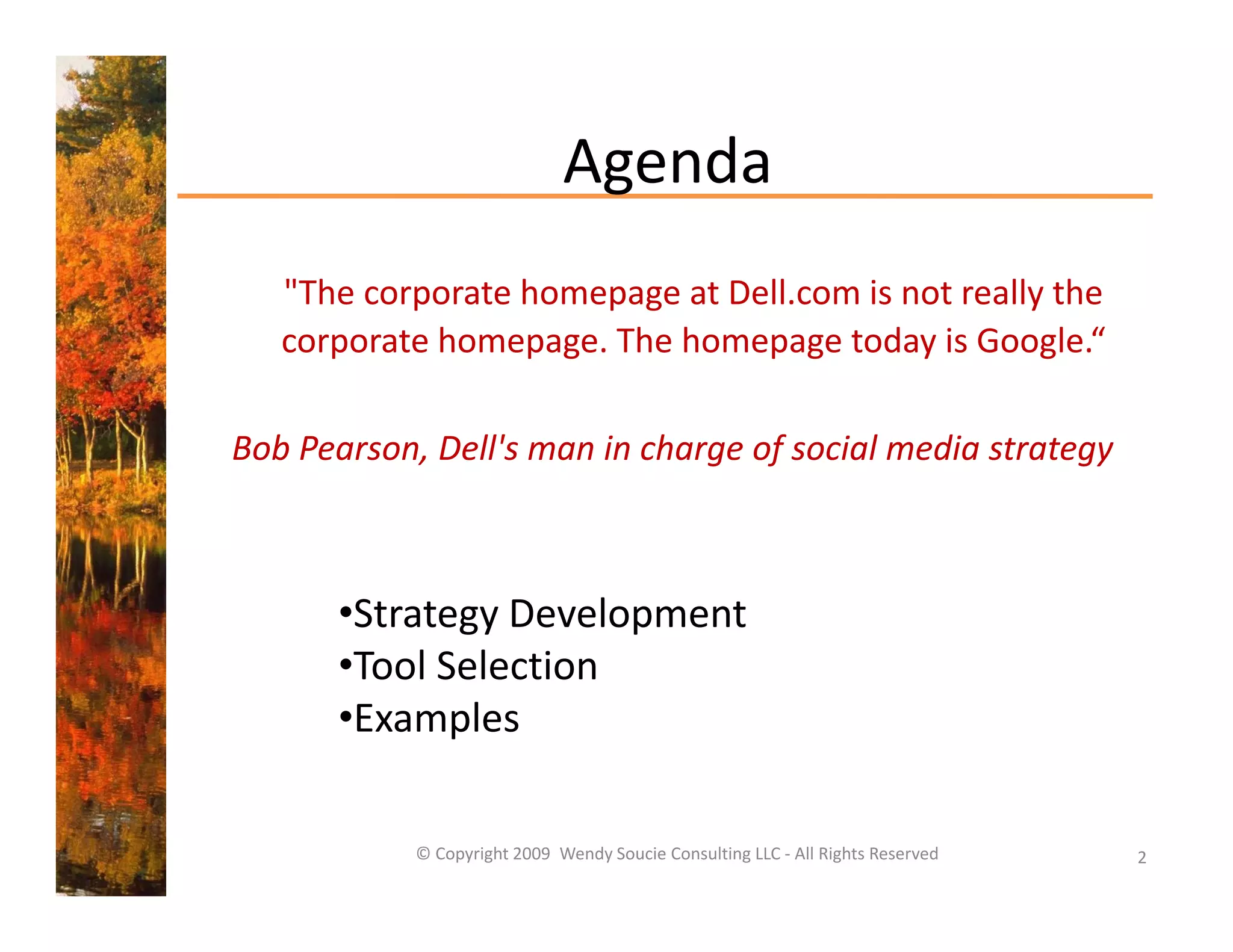 The document discusses social media strategy and tool selection. It recommends developing goals, objectives and a strategy before selecting social media channels and tactics. The strategy should clarify how objectives will be achieved and identify ways to engage internal and external audiences. Examples are provided of how Dell, Zappos, Mayo Clinic and others developed strategies and selected tools like blogs, Twitter and Facebook. The document concludes by providing contact information for Wendy Soucie, a social media consultant.