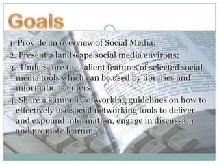 The document provides an overview of social media tools available for libraries, outlining their potential to enhance information delivery, engagement, and learning. It discusses various types of social media, such as blogs, microblogging, wikis, and social networking, highlighting their features and uses within library contexts. The document aims to serve as a guide for libraries to effectively utilize these technologies to connect with their communities and share information.