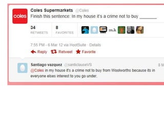 The document outlines a social media training session led by Emily Ryan, emphasizing the tools, challenges, and benefits of social media in today's digital landscape. It discusses the usage statistics among Australians, their expectations for engagement with government and brands, and provides examples of both successful social media campaigns and notable failures. Key takeaways include the importance of active consumer participation, the changing dynamics of communication, and the necessity for organizations to adapt their strategies to include social media effectively.