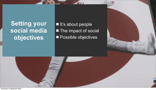 The document discusses social media strategies and objectives. It emphasizes that social media is about people, not clicks. Possible social media objectives include increasing brand equity, customer relations, PR, campaigns, customer satisfaction, and brand advocates. Measurable objectives could include numbers of videos, pictures, posts, comments, tweets, followers, and incoming links. The document provides a three-step model for social media initiatives: attract traffic, activate visitors, and engage users in conversations. It also discusses listening to conversations, engaging respectfully, and taking action such as social news marketing or blogger outreach.