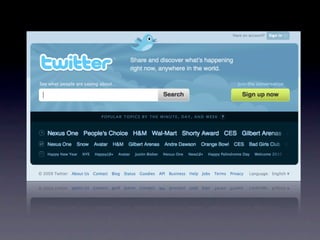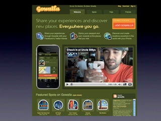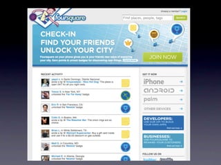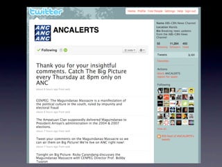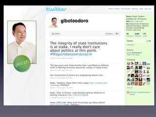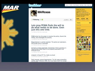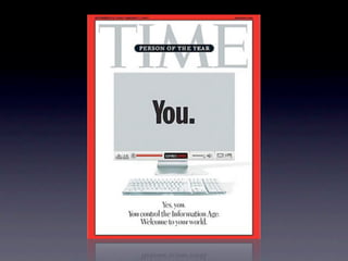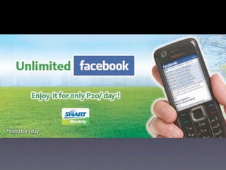 This document discusses trends in social media and mobile technology. It begins by explaining the difference between Web 1.0, which featured one-way publishing of content by professionals, and Web 2.0, which enables two-way sharing of user-generated content through platforms like YouTube, Flickr, blogs, Twitter, and social networks. It then provides examples of various types of social media like social networks, blogs, photoblogs, videoblogs, microblogs, and location-based social networking. The document notes that Filipinos are heavy users of social media and highlights statistics about Facebook and Twitter usage in the Philippines. It concludes by discussing some mobile trends like unlimited mobile data plans, Blackberry messaging, social media integration in