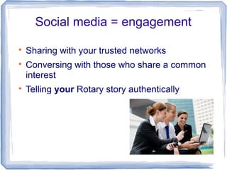 The document discusses the importance of social media for engagement and real-time information sharing, particularly for Rotary clubs and organizations. It highlights the use of various platforms like Twitter, Facebook, and LinkedIn for promoting clubs and facilitating collaboration. Additionally, it encourages Rotarians to showcase their unique stories through multimedia and offers resources for further learning.