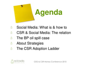 This document summarizes a presentation on social media and corporate social responsibility. It discusses how social media has democratized public spaces and increased transparency. It outlines different types of social media and principles of participation. It examines the relationship between social media and CSR, noting their common focus on transparency and accountability. The presentation uses the example of BP's oil spill to illustrate how social media can impact brands. It proposes a ladder model for CSR adoption on social media and provides strategies companies can take at each level, from listening to aligning business with social goals.